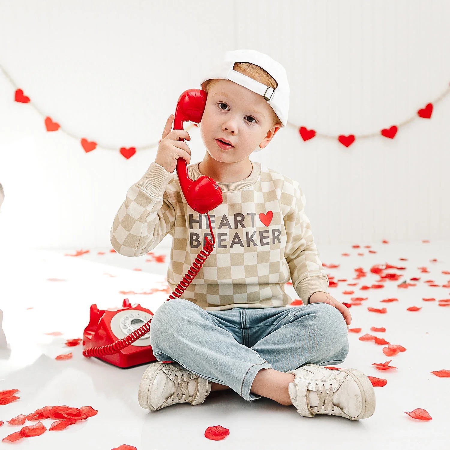 This checkered “Heartbreaker” sweatshirt brings the charm with a pop of red and a dash of attitude—perfect for the little guy who steals hearts everywhere he goes.