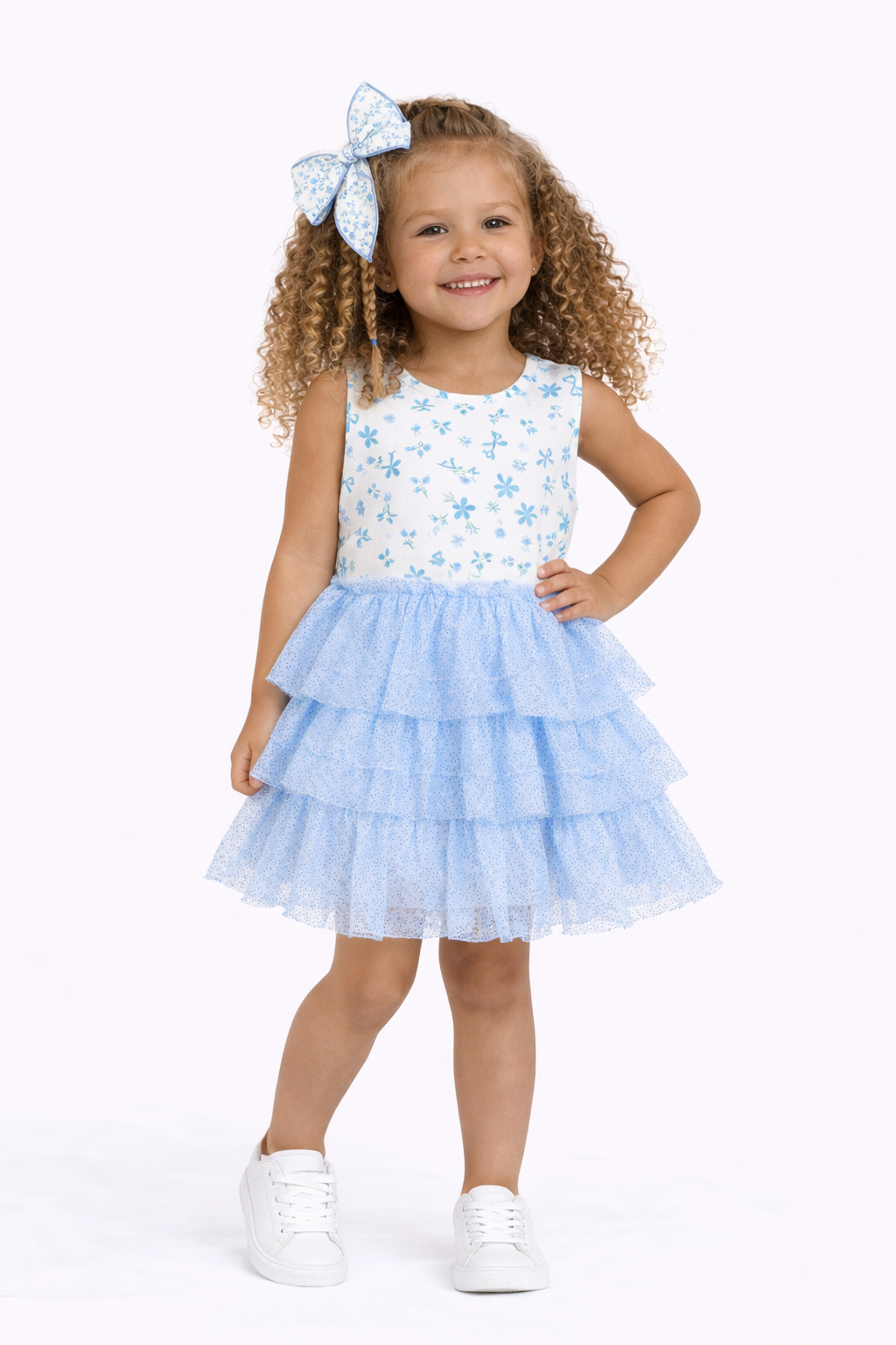 This darling dress combines a sweet, soft printed top with three dazzling layers of blue tulle, making every twirl a magical moment.