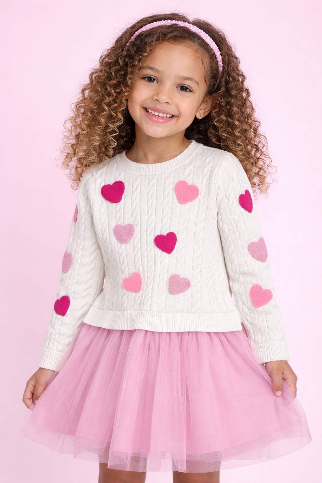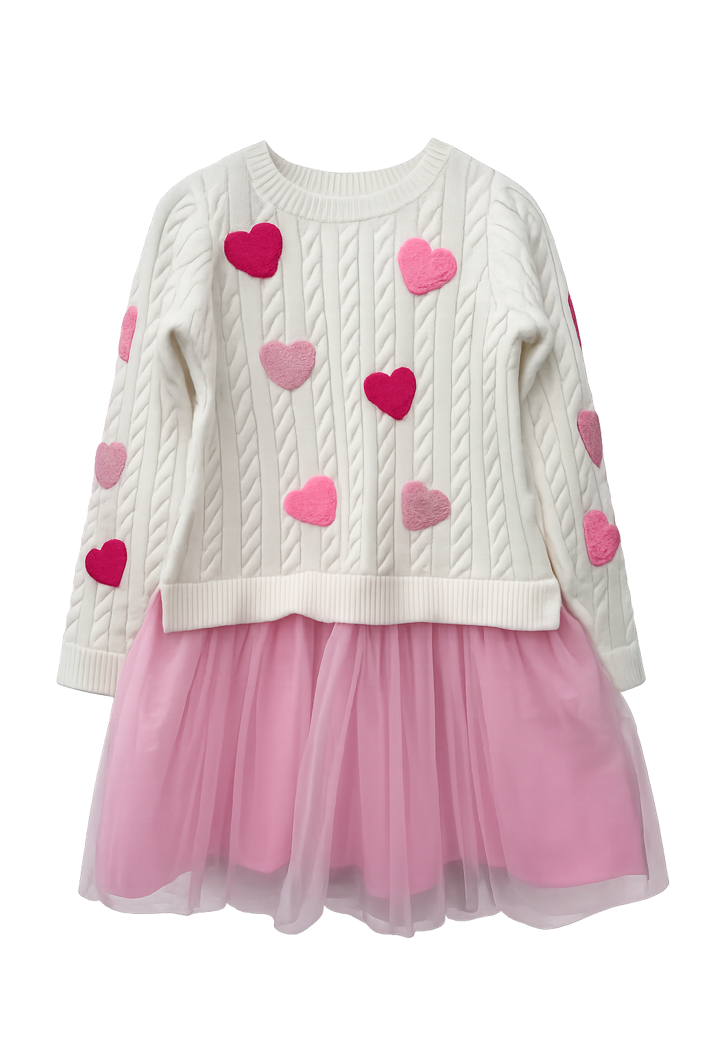 Sweet meets cozy in this heart-filled dress, made to celebrate love in the cutest way. Featuring a soft cable-knit sweater top adorned with plush heart appliqués and a dreamy layered tulle skirt, this dress is perfect for Valentine’s Day and beyond.